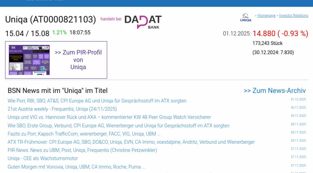 Uniqa am 1.12. -0,93%, Volumen 102% normaler Tage