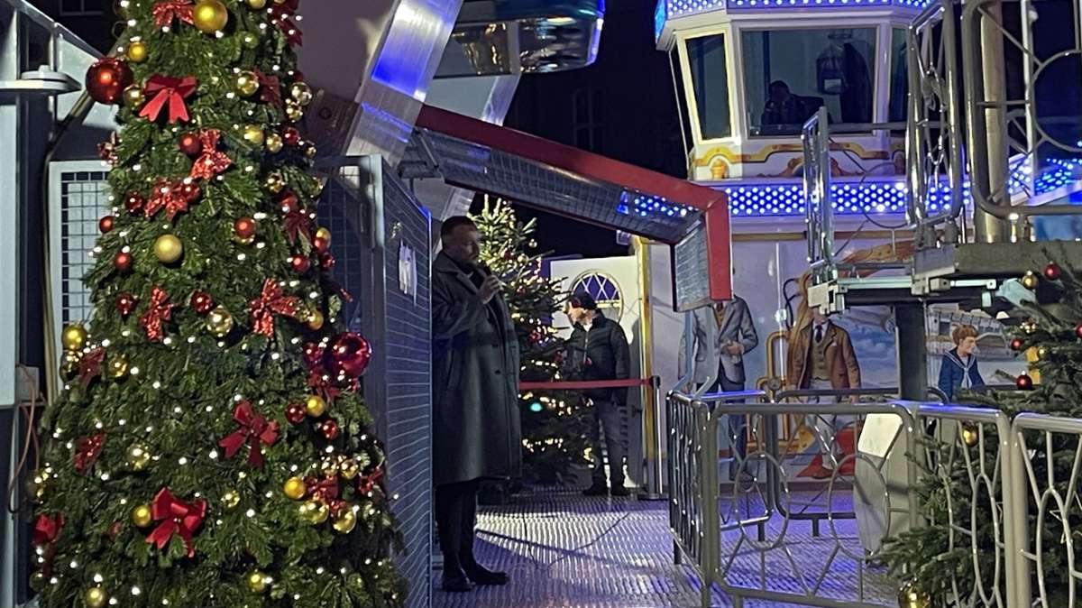 Vor dem Riesenrad im Ehrenhof des Neuen Schlosses erwartete das Publikum schließlich ein weiteres Highlight: Der international gefeierte Countertenor Nils Wanderer, der demnächst in der Metropolitan Opera in New York auftritt, gab sein Stück „St. Petersburg“ zum Besten. Die Performance wurde auf dem gesamten Schlossplatz übertragen – ein denkwürdiger Moment, dem zahlreiche Weihnachtsmarktbesucher auf dem Schlossplatz beiwohnten. Viele schlossen sich der Gruppe an und begleiteten das Spektakel bis zum Schlossgarten.