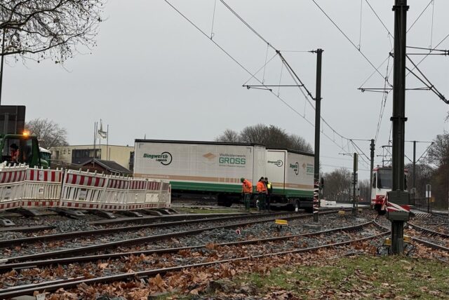 Ein Lkw mit Sattelauflieger blockierte U42-Gleise im Bereich Schulte Rödding. © Sophie Schädel