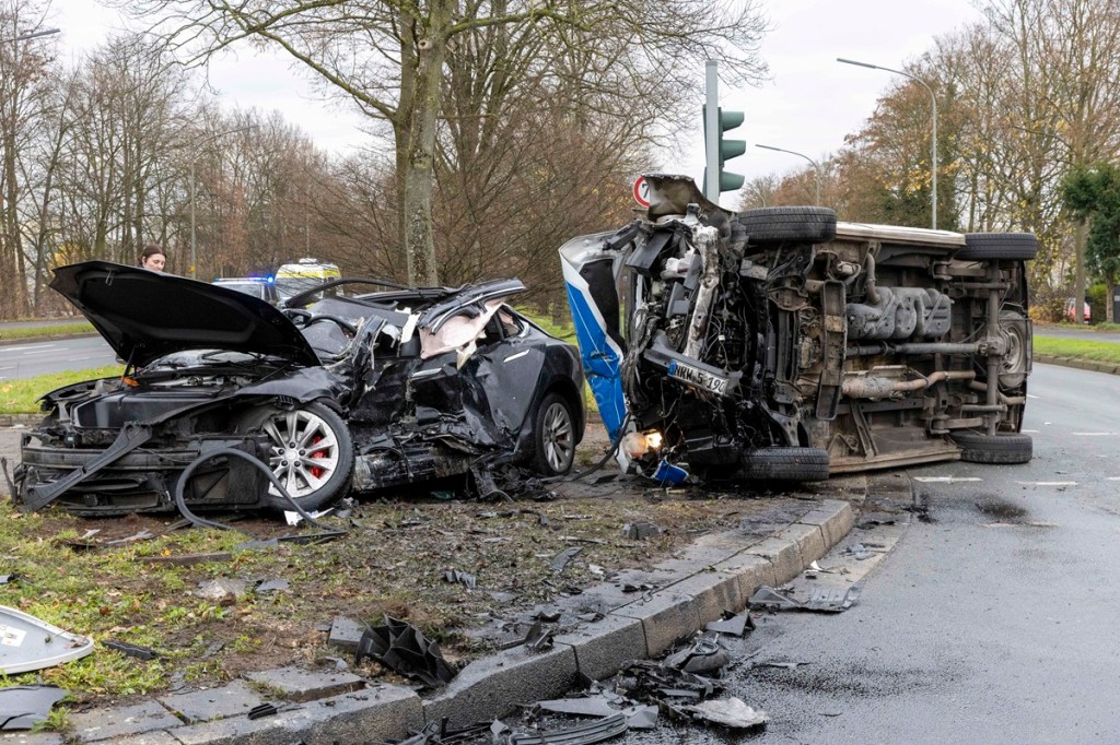 Dort ist ein Einsatzfahrzeug einer Hundertschaft der Polizei mit einem Tesla zusammengestoßen. Bilder vom Unglücksort deuten darauf hin, dass beide Fahrzeuge mit hoher Geschwindigkeit unterwegs waren.