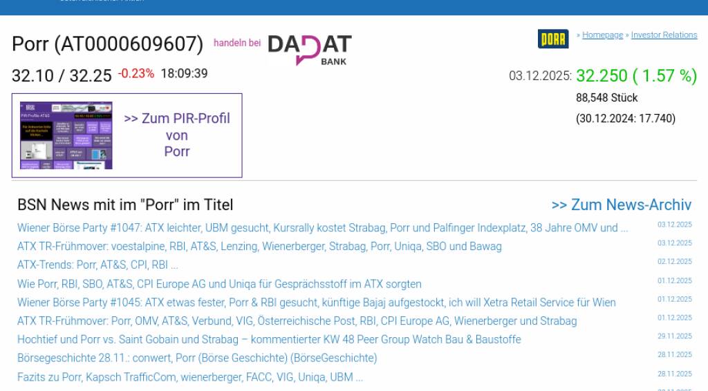 Porr am 3.12. 1,57%, Volumen 135% normaler Tage