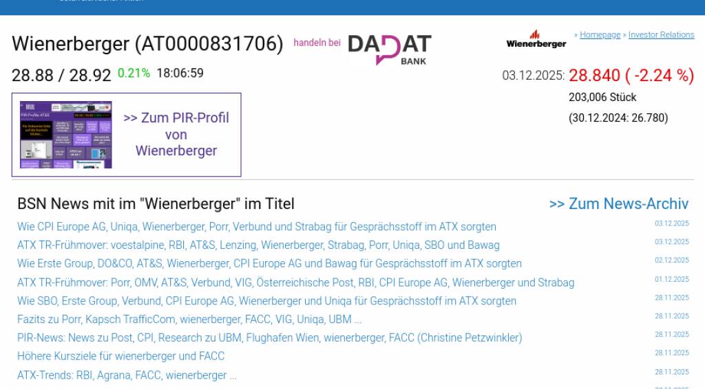 Wienerberger am 3.12. -2,24%, Volumen 93% normaler Tage