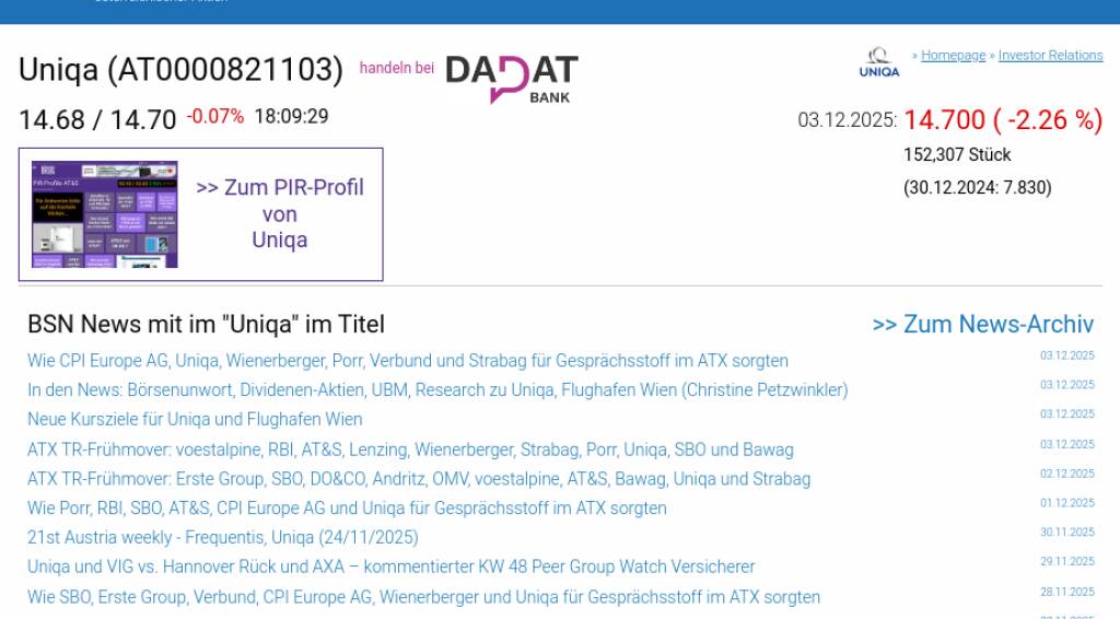 Uniqa am 3.12. -2,26%, Volumen 90% normaler Tage