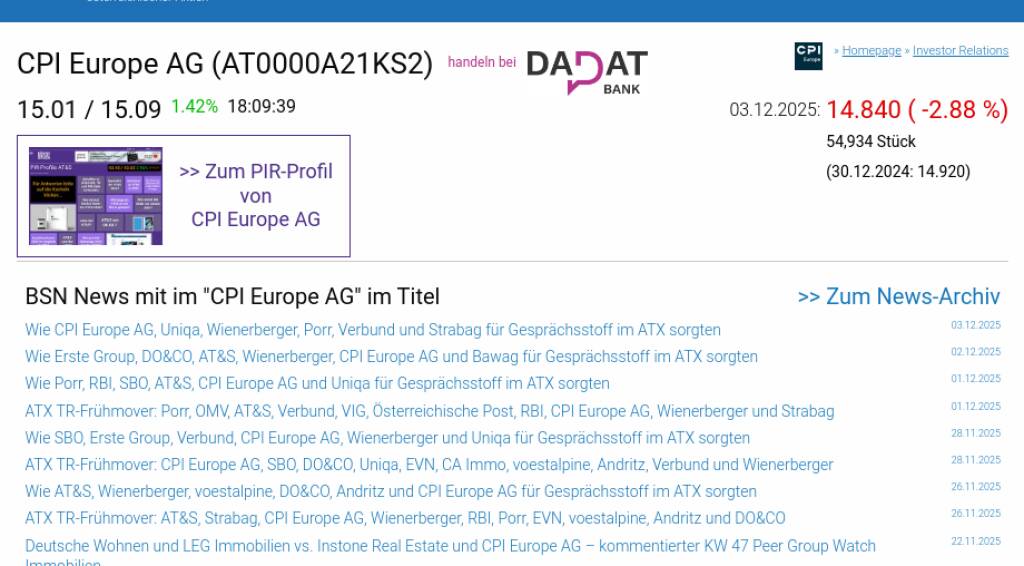 CPI Europe AG am 3.12. -2,88%, Volumen 118% normaler Tage