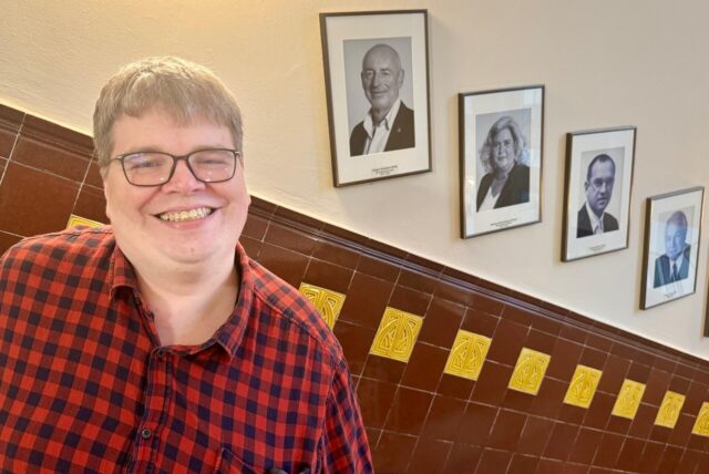Bezirksbürgermeister Jan Gravert im Treppenhaus des historischen Amtshauses. Hier hängen die Porträts der bisherigen Bezirksbürgermeister und Verwaltungsstellenleiter. © Jörg Bauerfeld