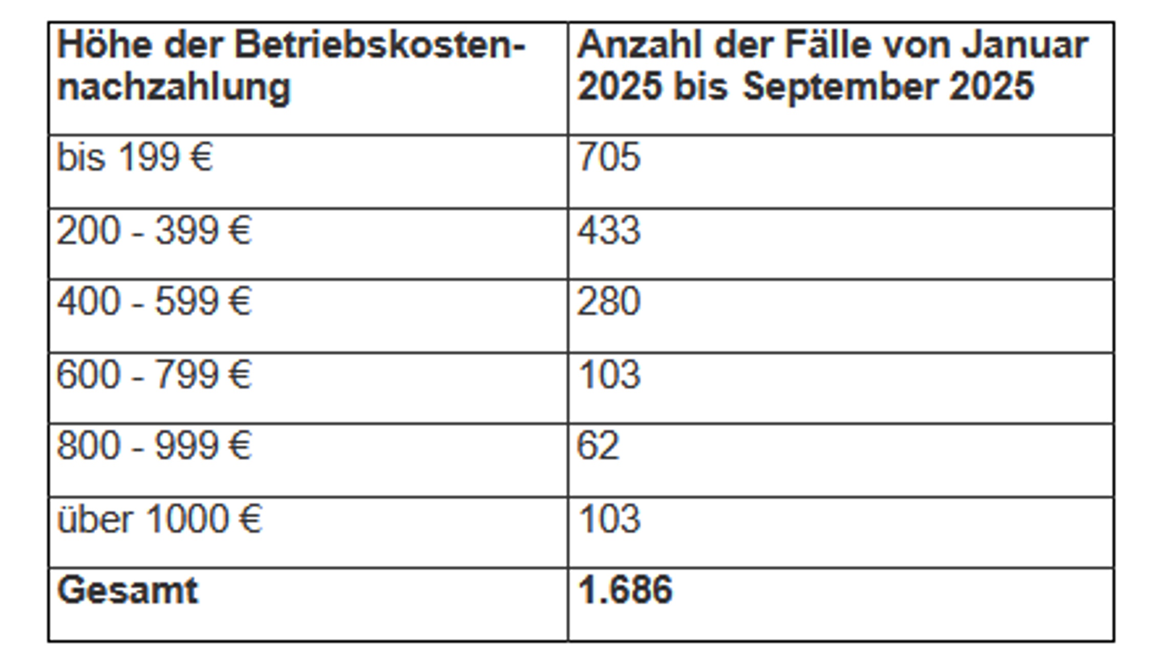 Die Antwort des Sozialamtes: „Im Zeitraum Januar 2025 bis September 2025 hat das Sozialamt Betriebskostennachzahlungen in 1.686 Fällen übernommen.“