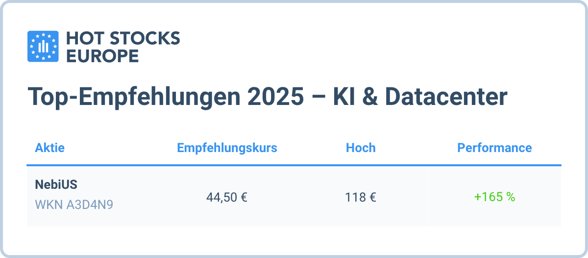 Der KI-Infrastrukturtrend dominierte 2025 die Märkte – und der Hot Stocks Europe war früh positioniert: NebiUS: von 44,50 € auf 118 € → +165 %