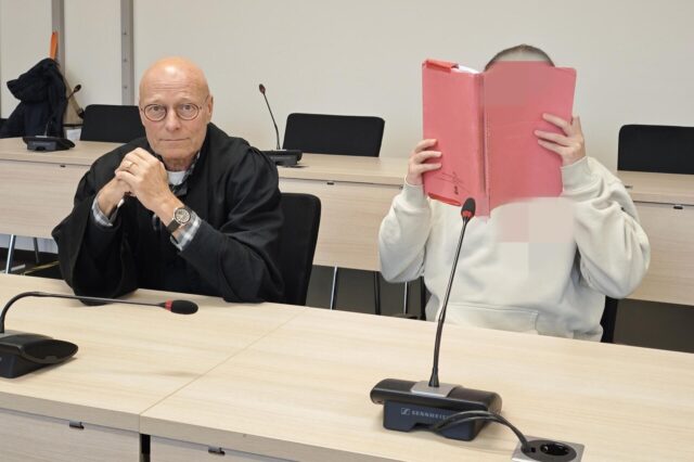 Wurde von Wahnvorstellungen gequält: Der 31-Jährige neben seinem Verteidiger Volker Schröder im Essener Landgericht. © Jörn Hartwich