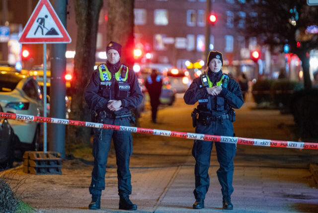 Einsatzkräfte der Polizei Hamburg stehen im Stadtteil Billstedt hinter einer Absperrung mit Flatterband der Polizei. © picture alliance/dpa