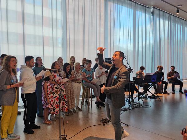 Also wirkt der Chor, wie bei der Probe in einer Schulaula in Berlin-Mitte deutlich wird, nicht mehr ganz so durchmischt wie zu Beginn. „Aber das Orientalische bleibt“: Chorleiter Omar Znkawan, selbst aus Syrien geflohen, studiert außer deutschen und englischen auch arabische, türkische und ukrainische Lieder ein, mit viel Spaß und Bewegung und meist einem Lachen im Gesicht.