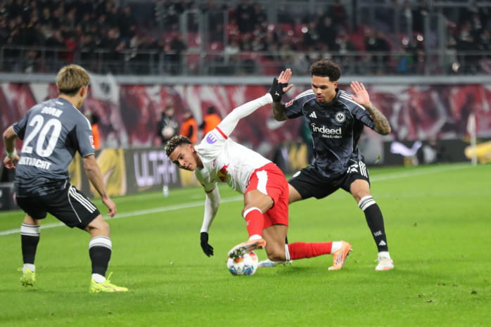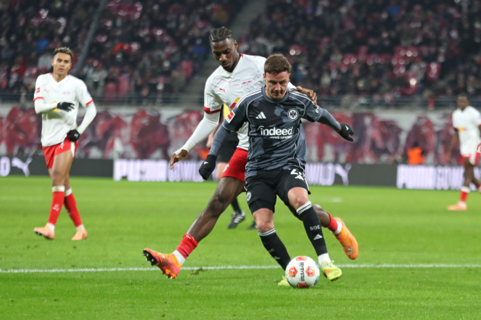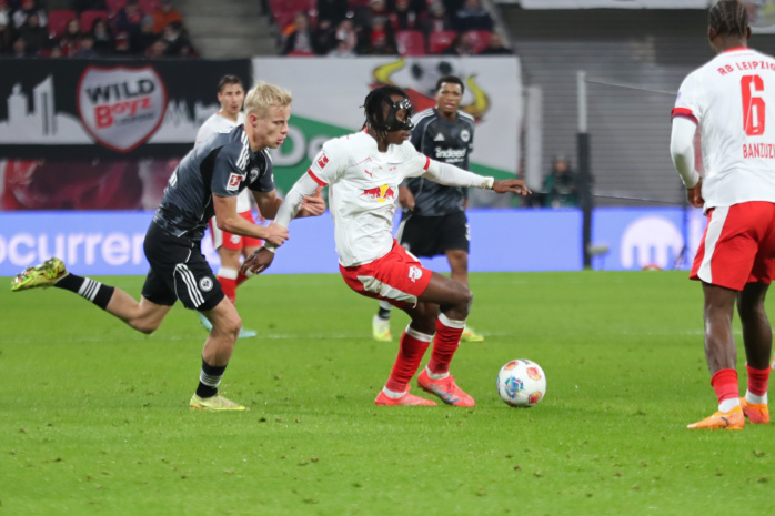 Antonio Nusa (7, RB Leipzig) gegen Nnamdi Collins (34, Eintracht Frankfurt). Foto: Jan Kaefer