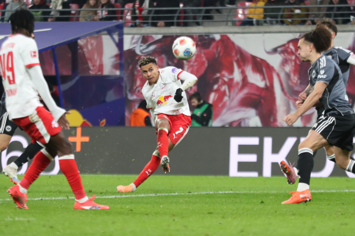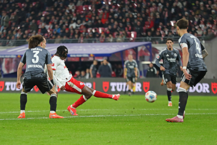 Yan Diomande (49, RB Leipzig) mit einem Tor-Schuss. Foto: Jan Kaefer