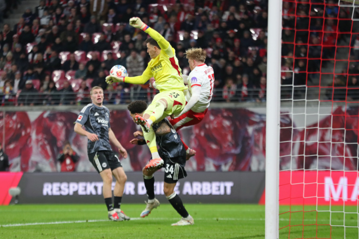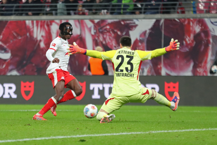 Yan Diomande (49, RB Leipzig) umkurvt Torwart Michael Zetterer (23, Eintracht Frankfurt) und erzielt ein weiteres Tor. Foto: Jan Kaefer