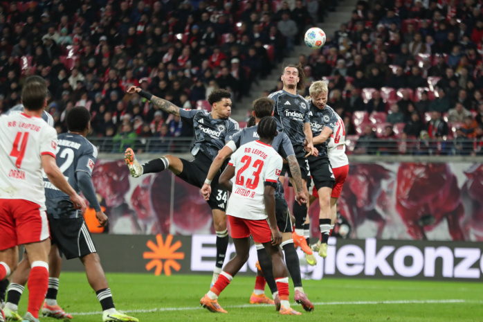 Arthur Theate (3, Eintracht Frankfurt) springt am höchsten. Foto: Jan Kaefer