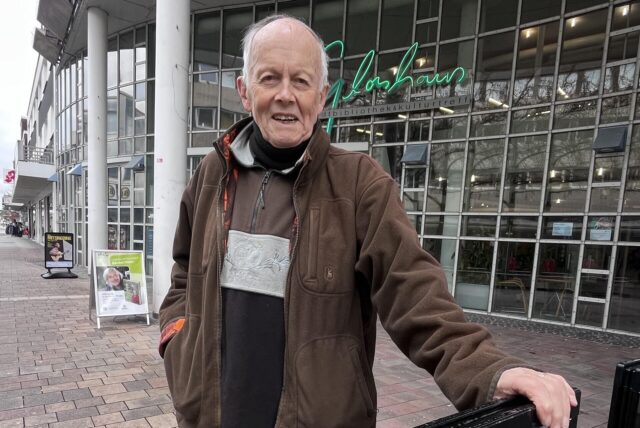 Clemens Köller (88) vor dem Glashaus. Als es gebaut wurde, passte er sein ehemaliges Geschäftshaus an der Antoniusstraße 17 mit einem Anbau (heute: Monja Moden) rundförmig an. © Harald Landgraf