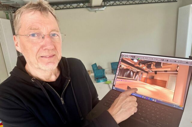 Helmer Lennerz (Bauteam Steigerturm) im neuen Kulturforum im Erdgeschoss des Steigerturms. Eine Computeranimation zeigt, wie es dort bald aussehen wird. © Jörg Bauerfeld