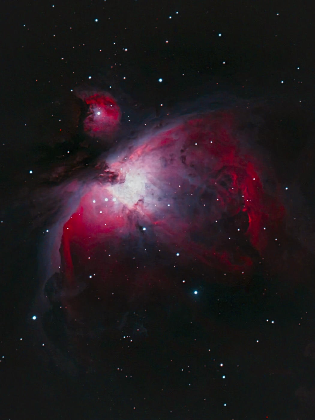 Mal aus einer anderen Sparte der Fotografie, da es zur Jahreszeit passt. Objekt: M42 Orionnebel, einer der hellsten Emissionsnebel (überwiegend Wasserstoff), der bei klarem Sternhimmel mit bloßem Auge zu erkennen ist und auch mit einer Fotoausrüstung mit Tele fotografiert werden kann. Im Zentrum des Orionnebels befindet sich die Geburtsstätte neuer Sterne. Dort entstehen aus gewaltigen Gas- und Staubwolken junge Sterne, deren Strahlung den Nebel zusätzlich zum Leuchten bringt und die charakteristischen Strukturen sichtbar macht. Dieses Foto habe ich mit meinem Eigenbau Foto-Newton und einer AstroCAM aufgenommen. Es wurden ca. 260 Aufnahmen zwischen 10 s und 30 s gemacht. Davon wurden etwa 50 aufgrund von Qualitätsmängeln wie Satelliten- und Flugzeugspuren sowie atmosphärischen Störungen aussortiert. Das Bild wurde anschließend in Fitswork gestackt, gestretcht und bearbeitet. Die Endbearbeitung und Konvertierung in den Adobe-RGB-Farbraum erfolgte in Luminar Neo.