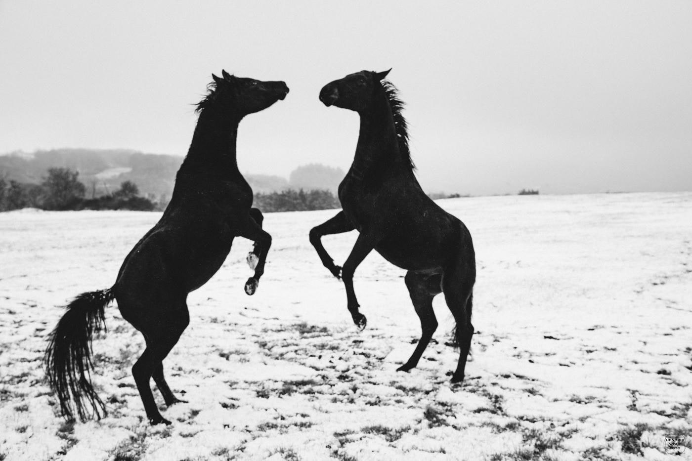 Der erste Schnee im Hunsrück, energiegeladene Pferde und der richtige Augenblick.