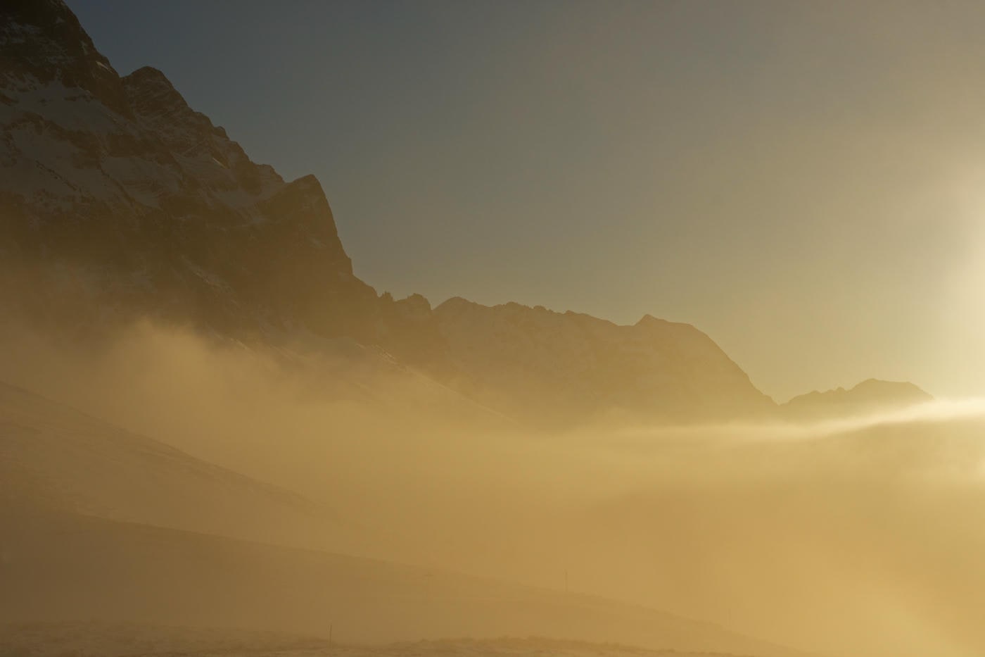 Am späten Nachmittag, am Ende einer Schneeschuhtour im Säntisgebiet, wanderte ich durch dichten Nebel auf dem Weg zur Schwägalp. Plötzlich öffneten sich kleine Lichtfenster im Grau, und die untergehende Sonne tauchte die Landschaft in ein magisches, fast unwirkliches Licht – eine Stimmung, die tief ins Herz drang und den Moment unvergesslich machte.