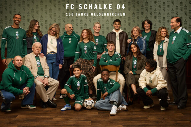 Diese Schalker repräsentieren die 18 Gelsenkirchener Stadtteile auf dem Sondertrikot. U. a. Joel Matip, Vitalie Becker, Mertcan Ayhan, Torwartlegende Norbert Nigbur (r.) und Ehrenpräsident Gerd Rehberg (sitzend, im hellen Anzug über dem Trikot). © FC Schalke 04
