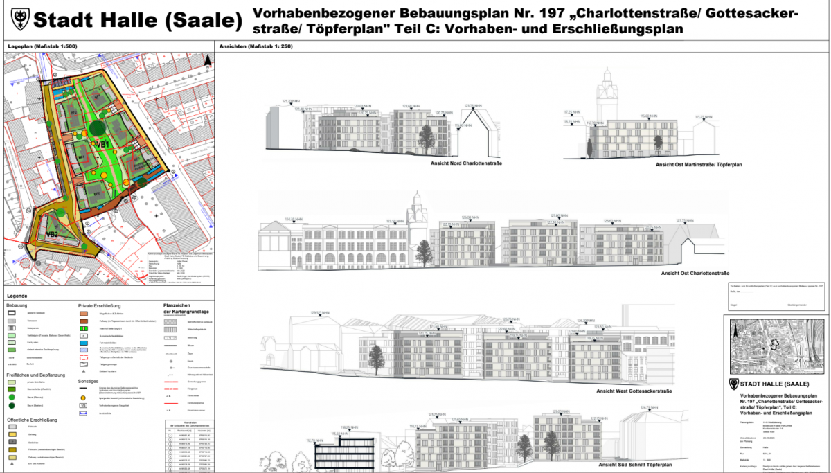 Eine der größten innerstädtischen Brachflächen Halles soll verschwinden: Auf dem rund 1,2 Hektar großen Gelände am Töpferplan plant die Leipziger Stadtbau AG ein neues Wohnquartier. Nachdem der Stadtrat bereits einmal eine Offenlage beschlossen hatte, musste der Bebauungsplan aufgrund denkmalrechtlicher Forderungen in diesem Frühjahr erneut ausgelegt werden. Am Dienstag fasste der Planungsausschuss nun den Abwägungs- und Satzungsbeschluss. Mit der noch ausstehenden Zustimmung des Stadtrats kann das Projekt in die nächste Phase gehen.