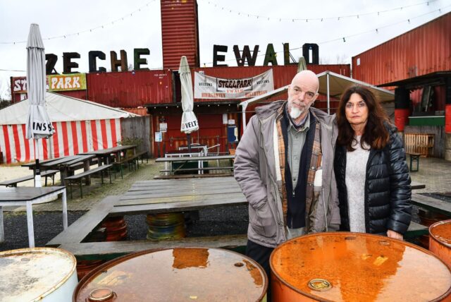 Wehmütig: Sabine und Stephan Hinrichs-Leschinski stehen am 8. Dezember 2025 in ihrem geschlossenenen Biergarten Steelpark auf dem Gelände der Zeche Ewald in Herten. © Olaf Krimpmann