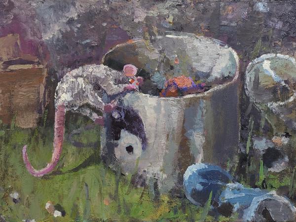 Fritz Bornstück schafft aus Ölfarbe und Ton humorvolle Werke (Abb.), die zwischen Mahn- und Denkmal schillern. Er setzt unseren Zivilisationsmüll bildfüllend in Szene und die Wesen, die sich darum „kümmern“.