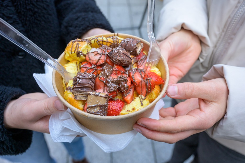 Die Influencerin probiert sich durch Brizza – eine Kombination aus Brezel und Pizza – Baumstriezel, Langos, gefüllter Ofenkartoffel und Kaiserschmarrn. Die gefüllte Ofenkartoffel ist ihr absoluter Favorit, doch die Kaiserschmarrn Bowls von Helin scheinen auch eine absolute Bereicherung für den Bochumer Weihnachtsmarkt zu sein.
