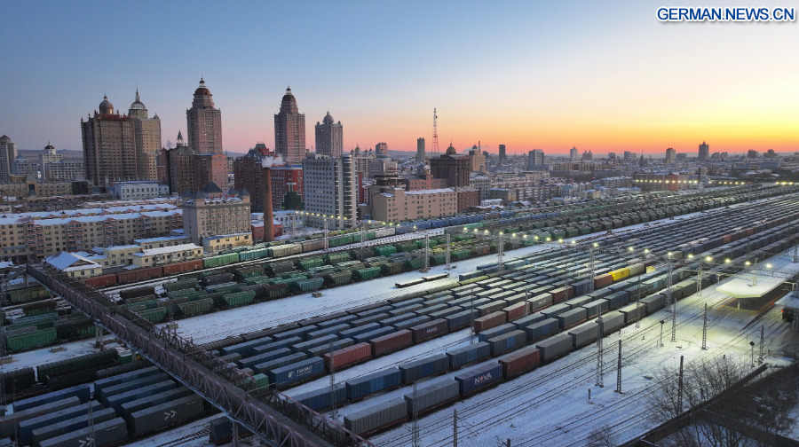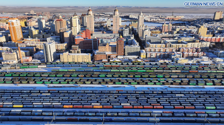 Der „östliche Korridor” besteht aus drei Eisenbahn-Grenzübergängen, darunter Manzhouli, Suifenhe und Tongjiang. Derzeit sind die Kategorien der von den Zügen transportierten Güter auf mehr als 1.000 Warenarten angestiegen. Die Anzahl der betriebenen Strecken hat sich auf 27 erweitert und verbindet mehr als 60 chinesische Städte mit 14 europäischen Ländern. (Foto von Wu Yunan/Xinhua)