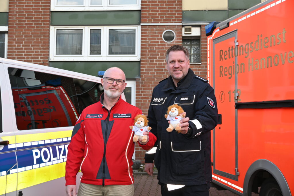 Jeweils 50 der kleinen Löwen wurden von Robert Muthmann, Präsident des Lions-Club Garbsen, und Lions-Mitglied Burkhard Dreier an die beiden Organisationen überreicht. Muthmann betonte dabei die besondere Bedeutung der Aktion: „Für Kinder ist eine Notsituation oft besonders beängstigend. Ein kleiner Plüschlöwe kann in diesem Moment ein Stück Sicherheit geben und helfen, Stress und Angst zu lindern.“ Wichtig sei dabei: Die Trostlöwen dürfen bei den Kindern bleiben.