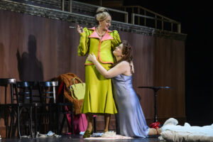 Susanne Blattert als ihre Mutter vertraut ihre minderjährige Tochter dem Maestro persönlich an. Exaltiert beklagt sie den Tod ihrer Tochter. Sie ist ein typisches Beispiel, zu welchen verantwortungslosen Deals überehrgeizige Eltern bereit sind, um ihrem Kind eine Karriere zu sichern. Ein Entlastungszeuge ist Mark Morouse als Professor Mezzacore. Begleitet von tiefen Blasinstrumenten deutet er an, sein Kollege sei im Umgang mit seinen Schülerinnen immer hundertprozentig korrekt gewesen, er selbst habe aber durchaus gewusst, die jungen Damen „etwas breiter zu fördern“. Morouse machte aus seinem kurzen Auftritt die beeindruckende Charakterstudie eines alten Schwerenöters, der mich fatal an die Affäre um Siegfried Mauser, den Leiter der Münchner Musikhochschule, im Jahr 2018 erinnerte. Charaktertenor Ralf Rachbauer gestaltete als Kammerdiener seine Zeugenaussage über Formicas geplantem Auszug aus der Villa, bei dem er den Professor neben der Leiche Formicas gefunden habe, mit dramatischer Wucht. Auch die beiden Zellengenossen Taschenkletterer (Tae Wan Jun) und Fassadendieb (Carl Rumstadt) lieferten Kabinettstückchen derber Erzählungen erlebter Sex-Abenteuer, während Gefängniswärter Melter (Ján Rusko), selbst Insektensammler, den Maestro bedrängte, ihm die singende Ameise zu überlassen.