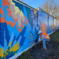 Jetzt leuchten riesige, bunt gesprühte Blüten von der Wand. Graffiti-Künstler Tobias Mohr („Mohr is more“) hat das Kunstwerk innerhalb von acht Tagen geschaffen – und sorgt damit für viel positive Aufmerksamkeit.