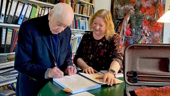 Beim Dreh in seinem Haus an der Ostsee signiert Armin Mueller-Stahl einen Bildband für NDR-Reporterin Mechthild Maesker.