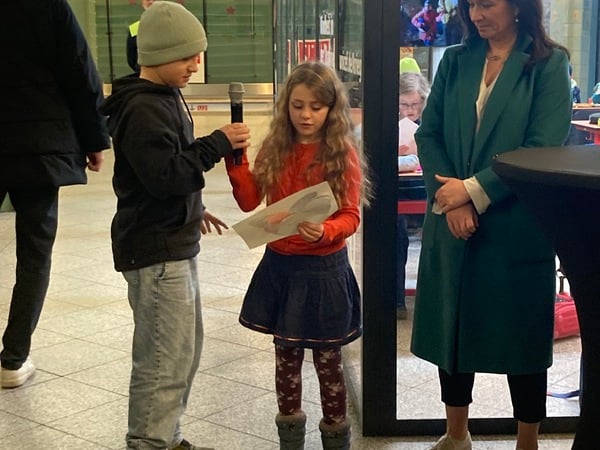 Laura und Matthie, Schüler der Jenaplanschule Neukölln, tragen die Wünsche ihrer Klasse an ukrainische Kinder vor.