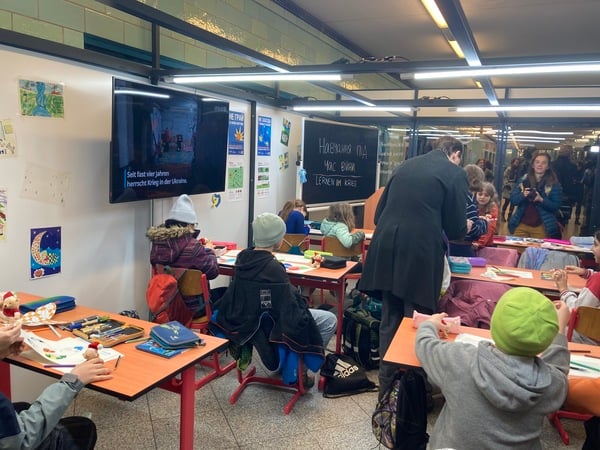 Hintergrund ist eine von Unicef angeregte Aktion, um auf den Alltag von ukrainischen Kindern während des Krieges aufmerksam zu machen. Mit der Unterstützung der BVG hat Unicef ein provisorisches Klassenzimmer im U-Bahnhof errichtet. Ein Ort, an dem täglich hunderte Menschen vorbeilaufen. Bis zum 21. Dezember wird das Klassenzimmer dort zu sehen sein, gibt Unicef an.