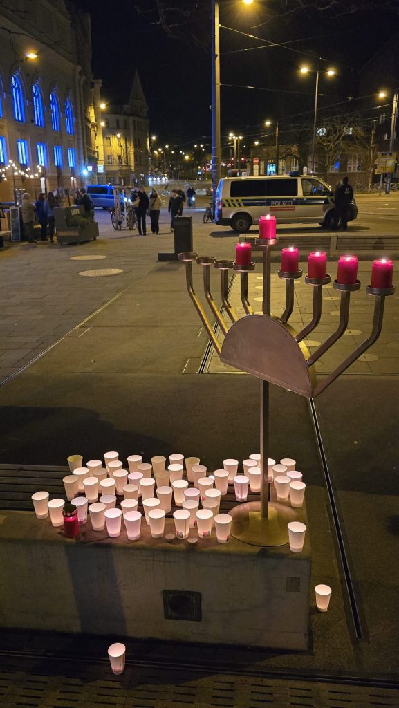 Das Steintor wurde an diesem Abend zu einem Ort stiller Erinnerung. Inmitten des städtischen Alltags, zwischen Straßenbahnverkehr und Passanten, entstand ein Raum des Innehaltens. Kerzen wurden an der Chanukkia entzündet, die Namen und Daten der 15 ermordeten Menschen verlesen. Viele Anwesende hielten Kerzen in den Händen.