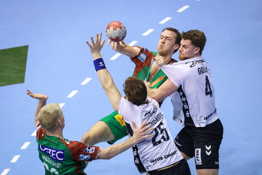 SC Magdeburg – SG Flensburg-Handewitt, GETEC Arena: Der Magdeburger Felix Claar (3.v.l) und Magnus Saugstrup (l) spielen gegen die Flensburger Lukas Jorgensen (2.v.l) und Johannes Golla (r). Foto: Ronny Hartmann/dpa-Zentralbild/dpa