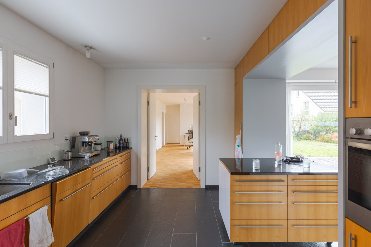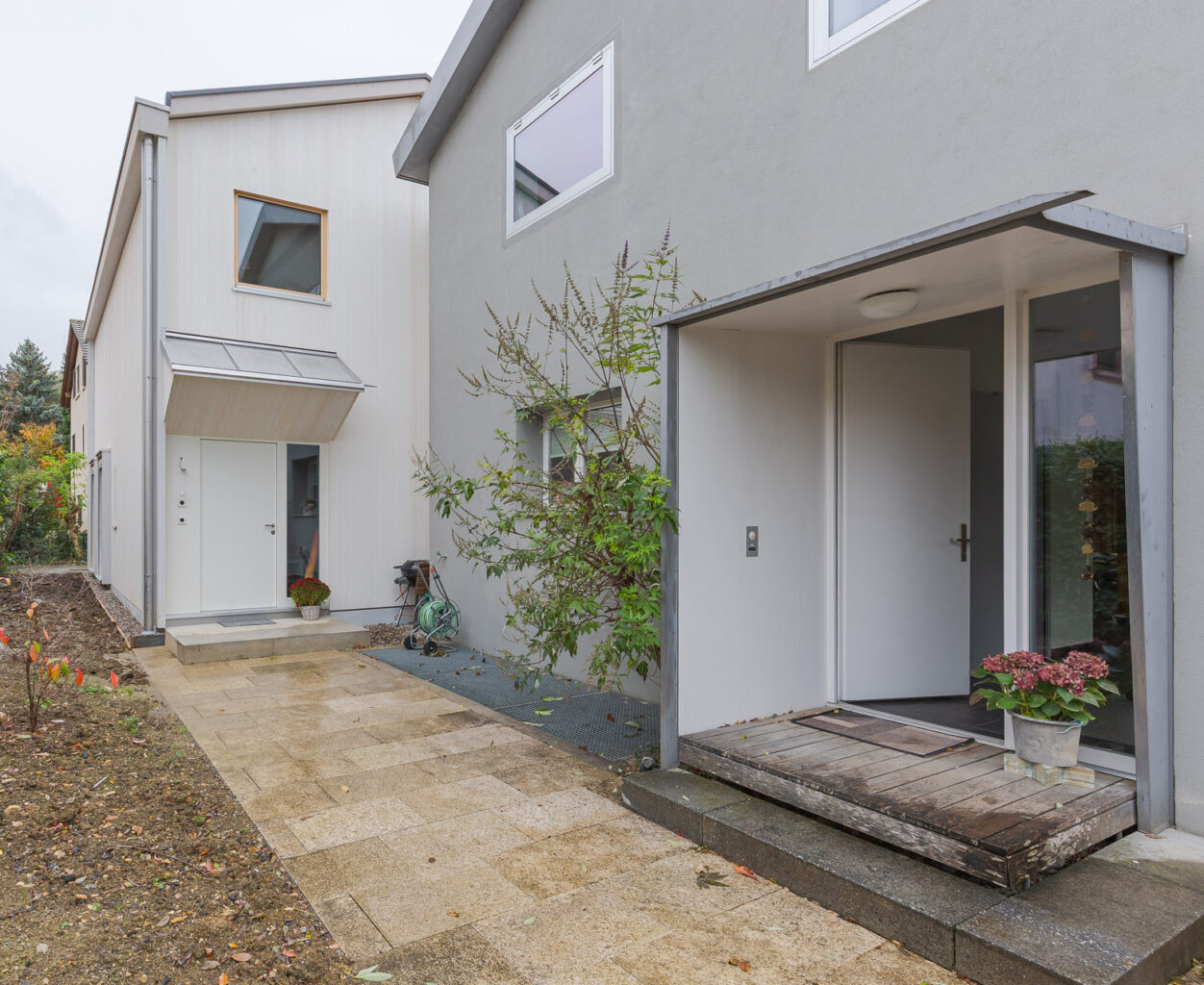 Stillgelegt wurde die bestehende einläufige Treppe. Sie wurde zum besonderen Reduit – mit schönen Eichenstufen als vielschichtige Ablage. Über die grossen Fenster zum Garten schweift der Blick zur hölzernen Fassade der Erweiterung. Das Erdgeschoss verfügt über vier stehende, bodenebene Fenster samt wertigem Holzrolladen. Das Obergeschoss zeichnet sich durch eine Fensterreihe mit hölzerner Balustrade aus. Die Holzfassade ist in einem warmen Hellgrau gestrichen. Sie blickt entspannt westwärts.