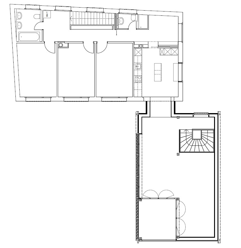 Im Erdgeschoss verbirgt sich hinter einer Doppelflügeltüre der Anbau. Über einen Arbeitsraum erreicht man zwei neue Schlafzimmer sowie ein altersgerechtes Bad samt schwellenloser Dusche. Der Wohnraum und die Küche blieben hingegen weitestgehend unangetastet. Die Eingriffe in den Bestand reduzierten die Architekten auf ein notwendiges Minimum.