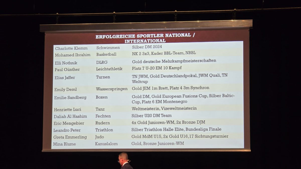 Traditionell findet die Ehrung am letzten Schultag vor den Weihnachtsferien statt. „Wir treffen uns, um Dank zu sagen, unsere Besten zu ehren und ein bisschen zu feiern“, sagte Schulleiter Axel Schmidt in seiner Ansprache. Die Sportschulen in Halle seien ein echtes Erfolgsprojekt. Gleichzeitig verwies Schmidt auf die Herausforderungen der heutigen Zeit: „Die vielen Reize unserer Gesellschaft bedeuten für uns, dass wir junge Menschen und ihre Eltern jeden Tag aufs Neue für den Leistungssport überzeugen müssen.“ Die Veranstaltung stehe deshalb vor allem für Wertschätzung. „Wir sind stolz auf das Erreichte“, betonte der Schulleiter.