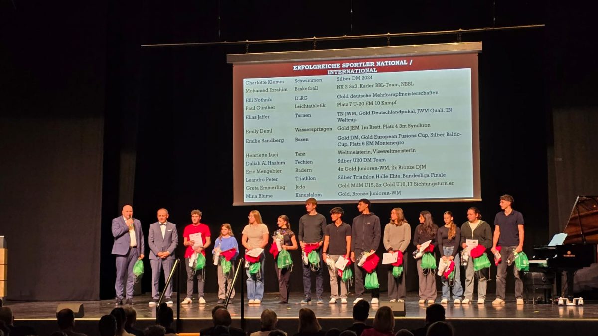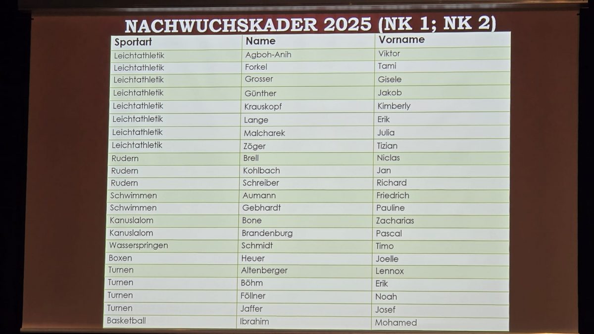 Darüber hinaus wurden mehrere Mannschaften für ihre Leistungen ausgezeichnet: die Ruderer, die Leichtathleten sowie die U14-Schwimmer. Insgesamt 22 Schülerinnen und Schüler erhielten die Berufung in den Nachwuchskader. Weitere 13 junge Sportlerinnen und Sportler wurden für erzielte Spitzenleistungen bei nationalen und internationalen Wettkämpfen besonders geehrt.