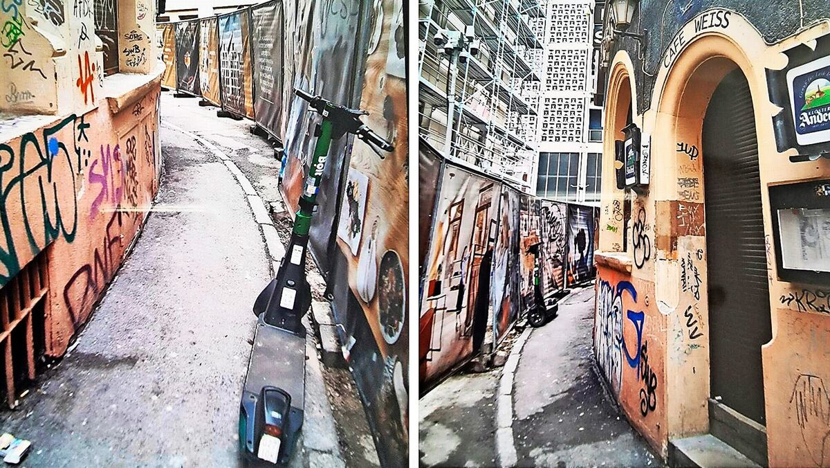 Der Baustellenzaun für das Projekt Vier Giebel rückt den Häusern und Bars im Ausgehviertel der Geißstraße immer näher. Rechts: dDer Baustellenzaun für das Projekt Vier Giebel rückt den Häusern und Bars im Ausgehviertel der Geißstraße immer näher. Rechts: das verbaute Café Weiß. FOTO: GEA