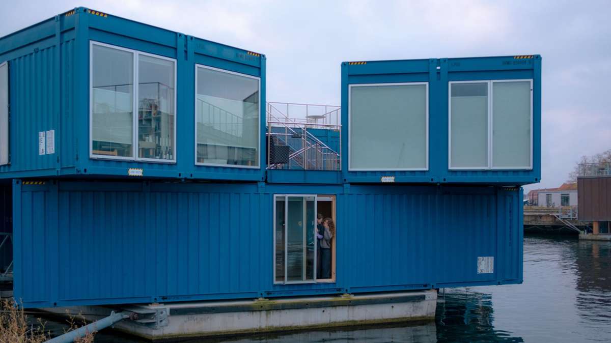 Wenn Amelie und Jonas aus dem Fenster gucken, ist da weit und breit kein lästiges Nachbarhaus, das Sicht und Licht rauben könnte. Stattdessen: das glitzernde Meer – und ein paar Container. Manchmal schiebt Jonas das bodentiefe Fenster gleich am Morgen auf, springt kopfüber hinaus ins Wasser. Manchmal trifft er Enten und Schwäne. Dann schwimmt er, schwimmen sie eine Weile umher, bevor Jonas wieder in den dunkelblauen Container steigt, duscht, frühstückt und zur Arbeit radelt.