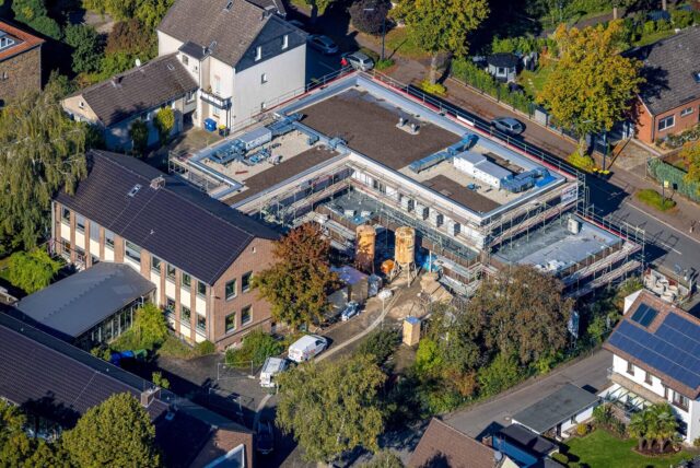 Die Dudenrothschule aus der Luft, während Anbaubarbeiten für den neuen OGS-Bereich laufen: Im Bestandsgebäude sorgt alter Parkettkleber weiterhin für Sanierungsaufwand. (Archivbild) © Archiv (Blossey)
