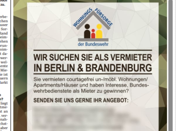 In einer Anzeige bittet die Wohnungsfürsorge der Bundeswehr Berliner Vermieter, sich mit Wohnungsangeboten zu melden.