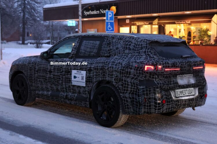 Am Heck sehen wir ein beinahe durchgehendes Leuchtenband, das in der Mitte nur vom BMW-Logo unterbrochen sein dürfte. Abzuwarten bleibt, ob das rote Band ähnlich hoch wie beim iX3 ausgeführt oder doch etwas schmaler gehalten wird. So oder so wird über das Innenleben eine L-Form angedeutet werden, die den BMW X5 auch bei Nacht klar als BMW erkennbar macht. Wie schon auf früheren Fotos sind erneut die minimalistischen Türgriffe zu sehen, die wie bei Skytop und Speedtop als kleine Finnen am Übergang zu den Seitenscheiben ausgeführt sein werden. "