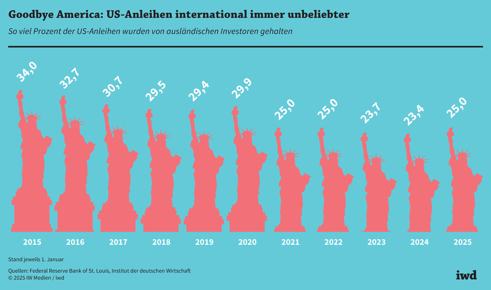 Der Anteil ausländischer Investoren an der Staatsverschuldung der USA ist Anfang 2025 auf rund 25 Prozent gesunken – damit sank das Engagement ausländischer Anleger in den vergangenen zehn Jahren um 9 Prozentpunkte.