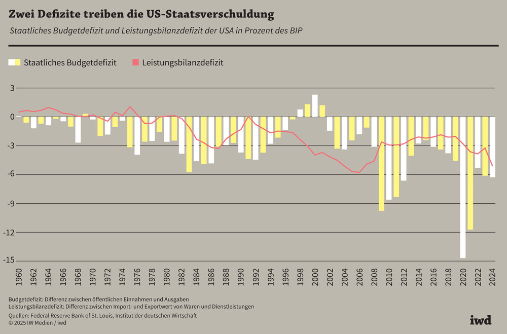 Doch wie lange können sich die Vereinigten Staaten noch auf diesem Vertrauensvorschuss ausruhen und weiterhin auf Pump haushalten? Schließlich wächst seit Jahrzehnten ihr sogenanntes Twin Deficit, also das doppelte Defizit aus Haushalts- und Leistungsbilanz (Grafik):
