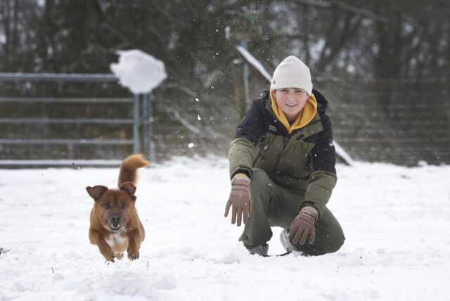 Mael (11) und sein Hund Lou haben großen Spaß im verschneiten Park am Haus Opherdicke. © Stefan Milk