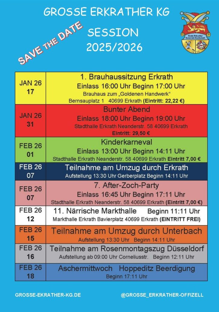 Mit der 1. Brauhaussitzung startet die Große Erkrather KG 2026 in den Karneval. Zwei Wochen später folgt am 31. Januar der Bunte Abend, für den es nur noch wenige Restkarten gibt. Das gilt auch für den Kinderkarneval am Tag darauf (1. Februar). Am 7. Februar zieht wieder der Lindwurm durch Erkraths Straßen, an dem sich auch die Große Erkrather beteiligt, die anschließend zur After-Zoch-Party in die Stadthalle einlädt.